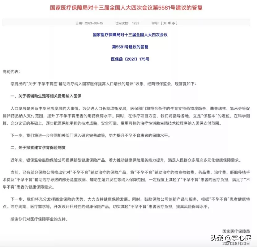 2021年9月15日,在国家开放三胎政策的背景下,国家医疗保障局网站公布了国家医保局经银保监会答复全国人大代表高莉提出的“关于‘不孕不育症’辅助治疗纳入国家医保提高人口增长的建议”。