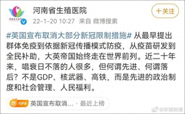 1月20日10时27分,河南省生殖医院发布微博,提到“从最早提出群体免疫到依据新冠传播模式防疫,从疫苗研发到全民补助,大英帝国始终走在世界前列……”